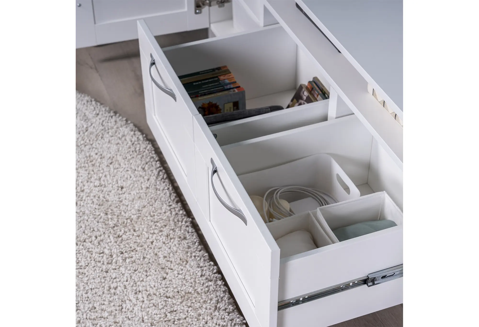 Фасадная часть организована рационально - по бокам расположены две распашные дверцы для скрытого хранения, в центре — два наружных выдвижных ящика, а над ними открытая ниша. В нише удобно разместить приставки, медиаплееры или роутер, обеспечив свободный доступ к технике и коммуникациям. Выдвижные ящики подойдут для пультов, кабелей, документов и других мелочей, которые важно держать под рукой, но вне поля зрения.