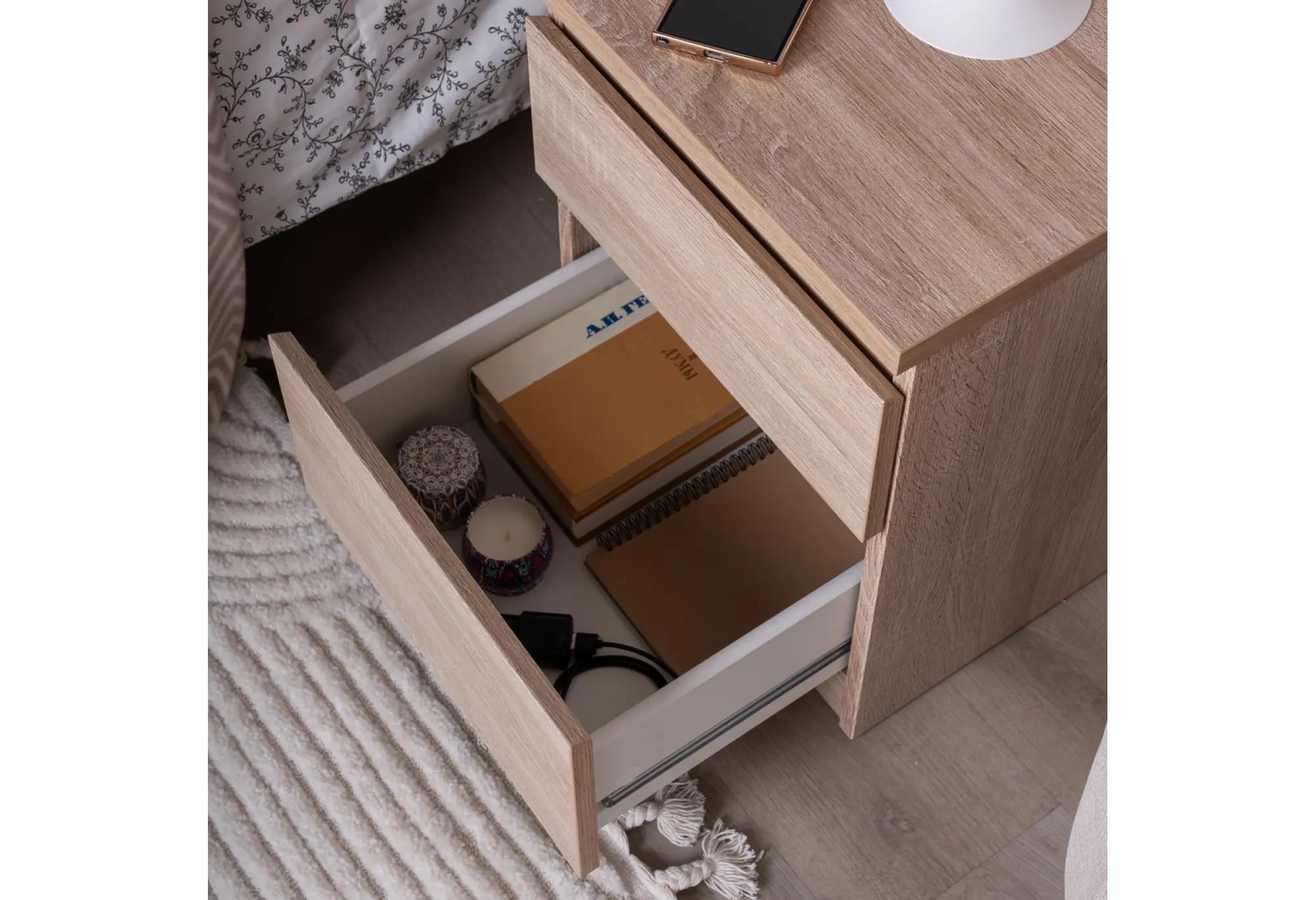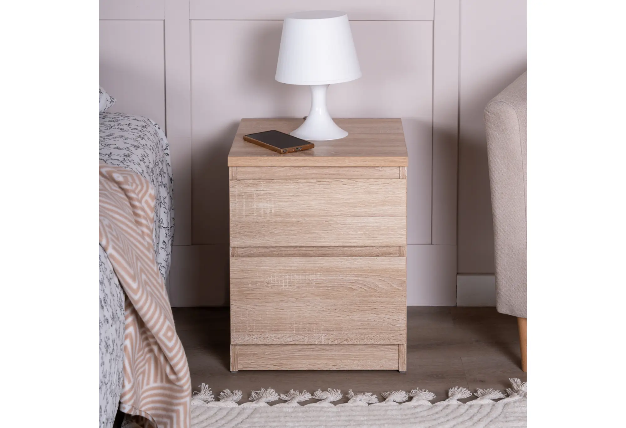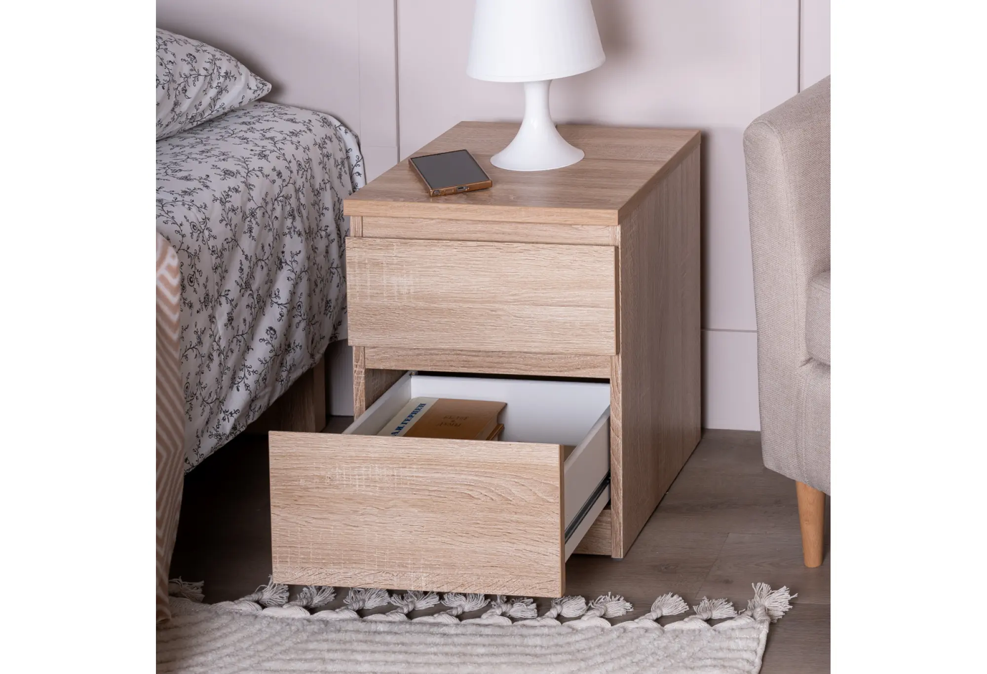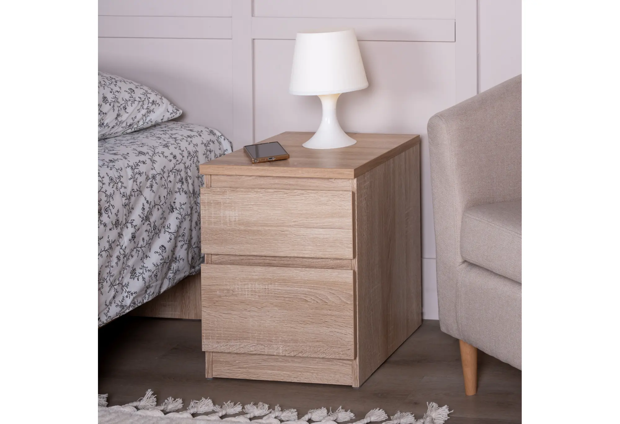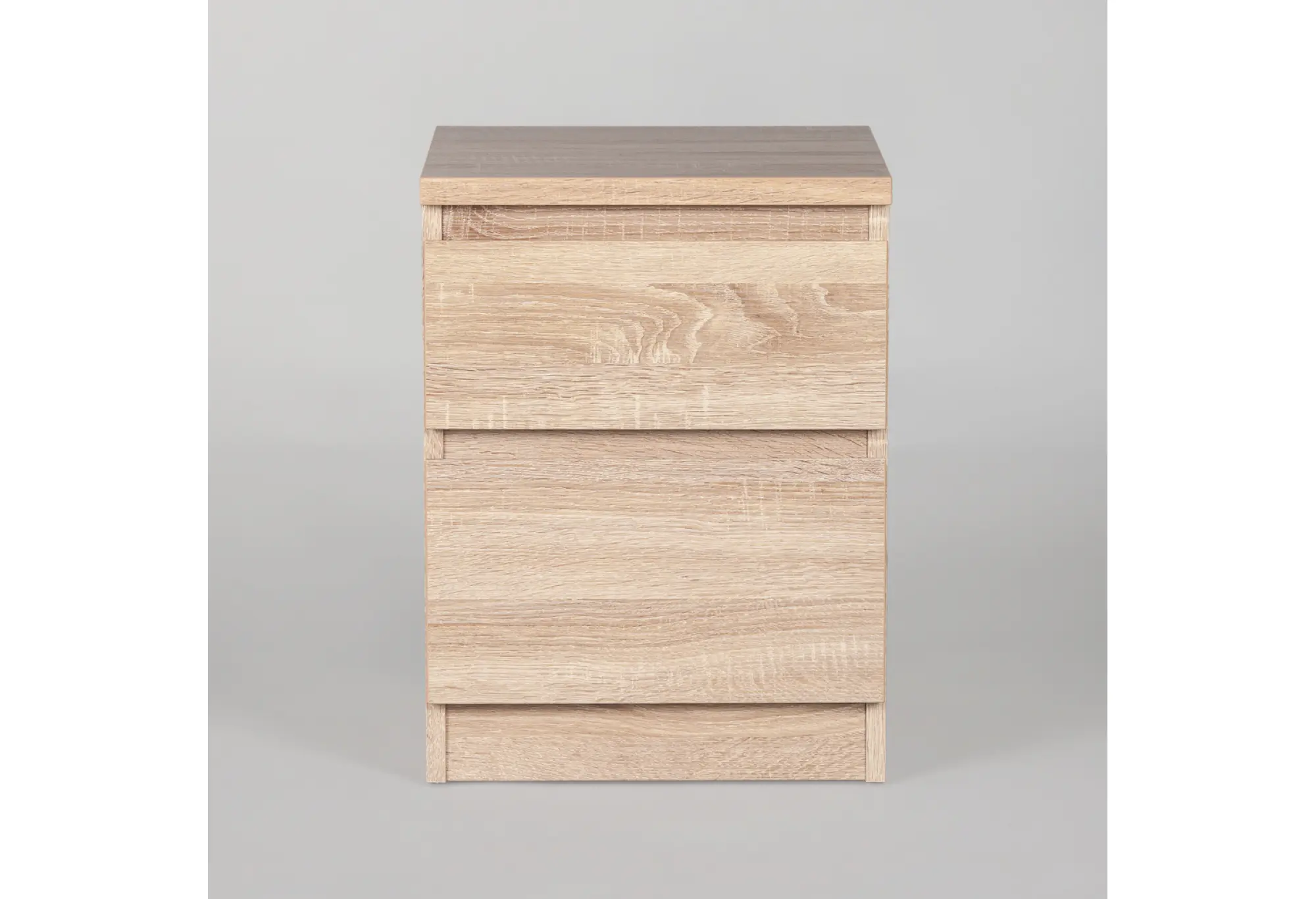 Компактная тумба с двумя выдвижными ящиками в оттенке дуб сонома создана для удобного хранения мелочей и документов в спальне, кабинете или гостиной. Нейтральный серовато-древесный тон легко сочетается с большинством современных интерьеров и не перегружает пространство.