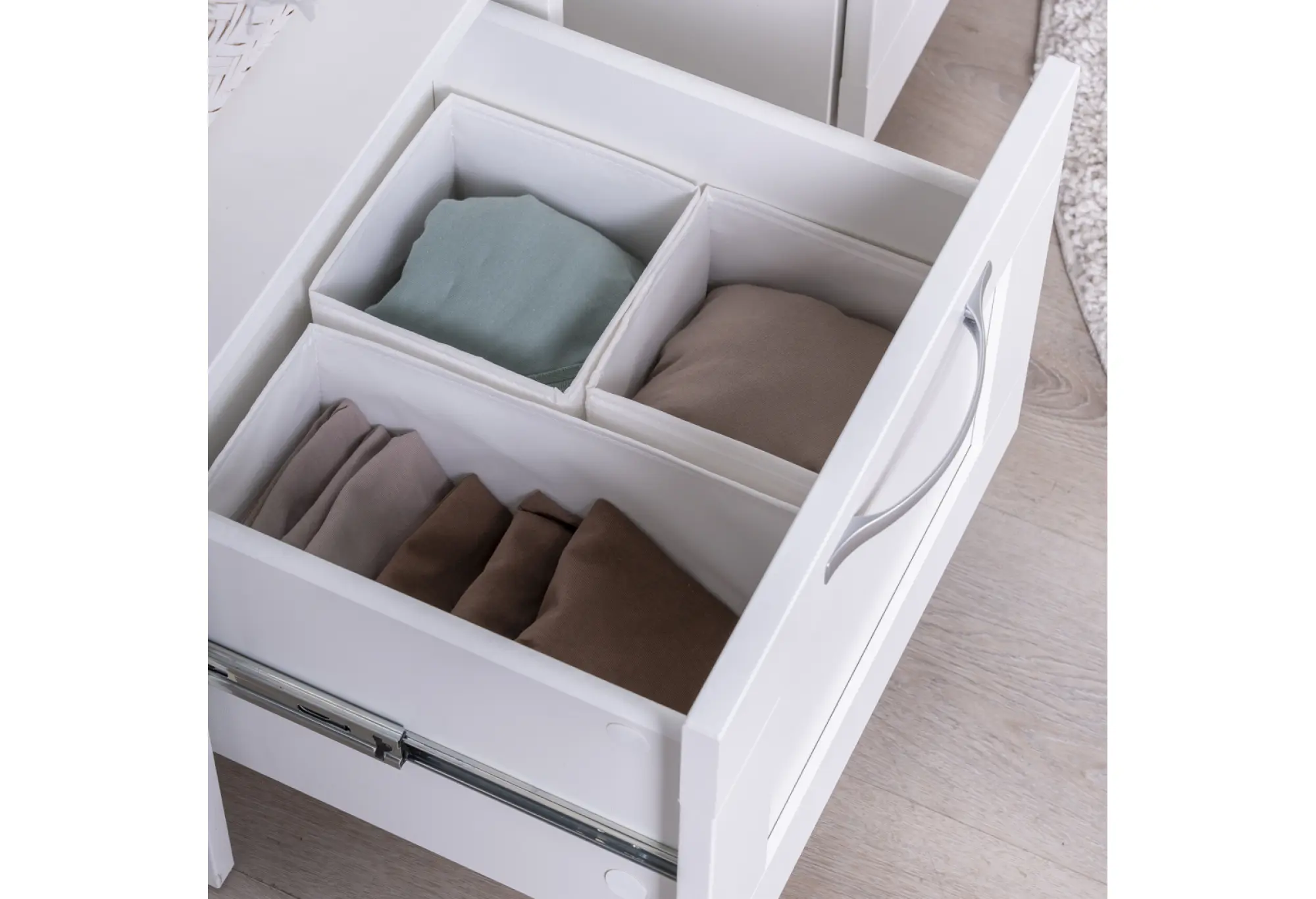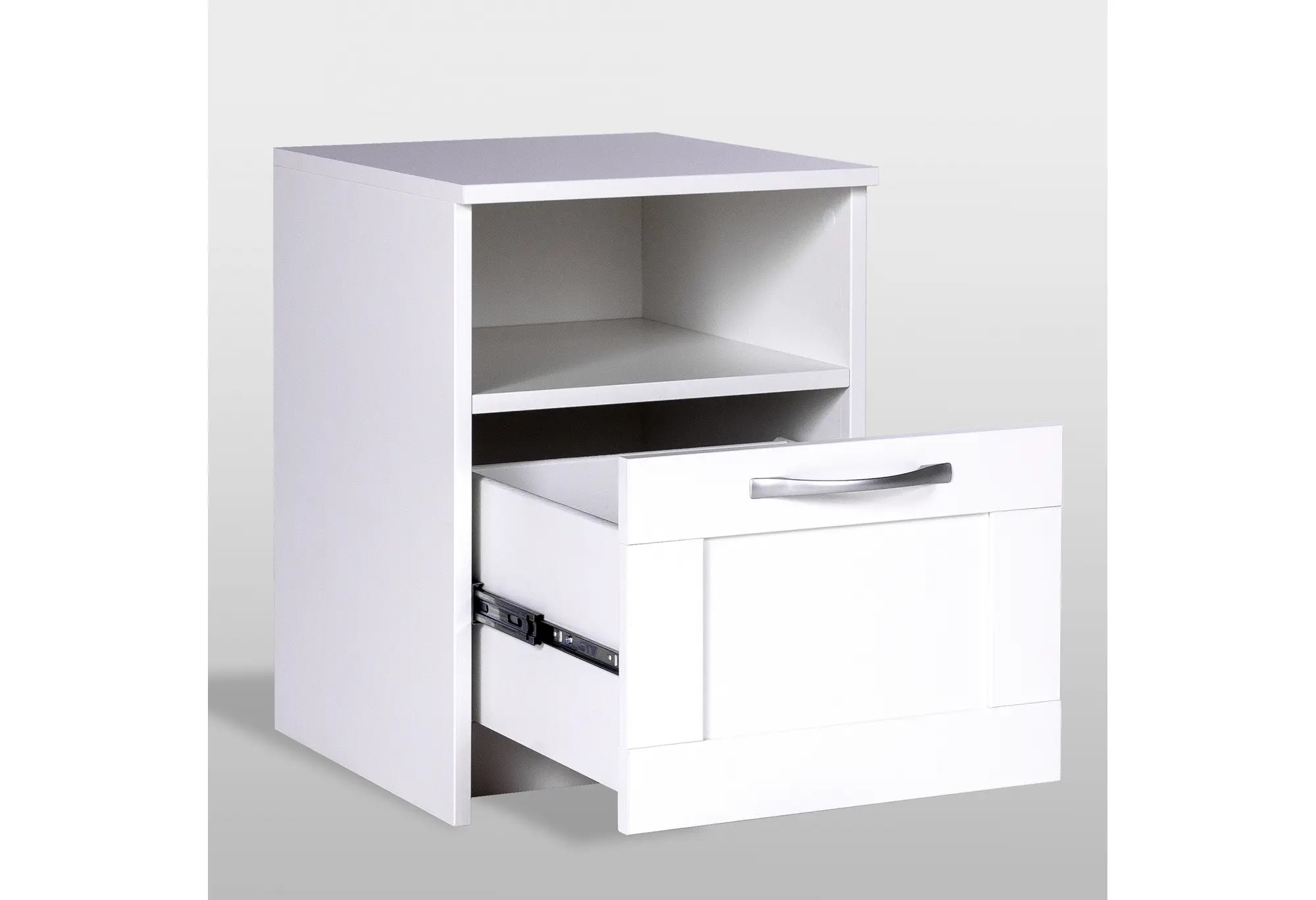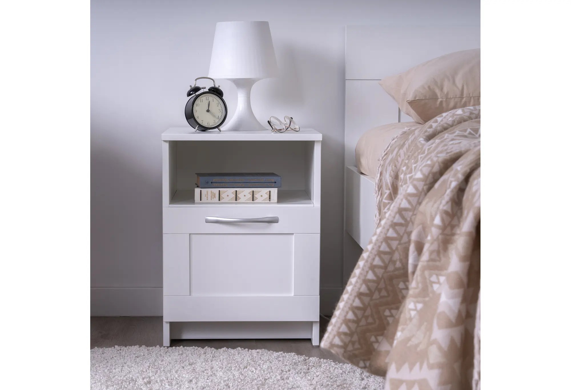 Тумба включает открытую нишу и выдвижной ящик. В нише удобно хранить книги, гаджеты, зарядные устройства или предметы, к которым нужен быстрый доступ. Ящик рассчитан на нагрузку до 8 кг — этого достаточно для белья, документов, аксессуаров и других бытовых мелочей. Шариковые направляющие обеспечивают плавное и тихое выдвижение, облегчая ежедневное использование.