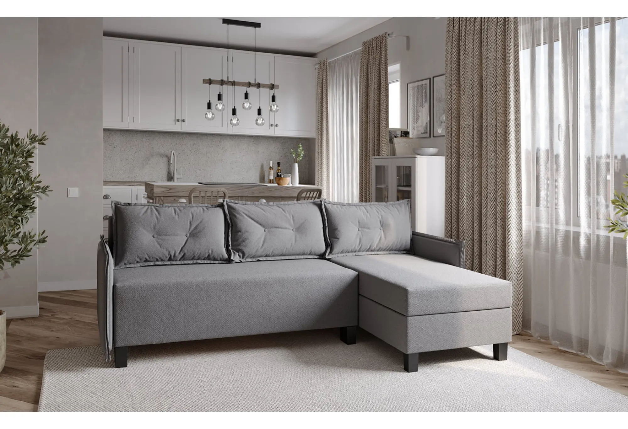 Угловой диван-кровать Туули в серой рогожке — практичное решение для современной гостиной в скандинавском стиле. Лаконичные формы, ровные линии и сдержанный серый цвет делают его универсальным вариантом для интерьеров в нейтральной гамме, лофта, минимализма или современного классического стиля.