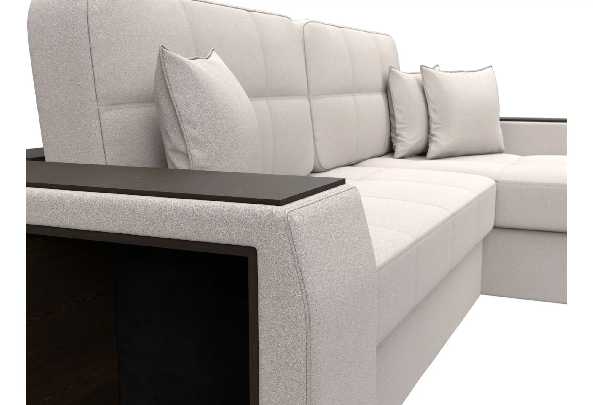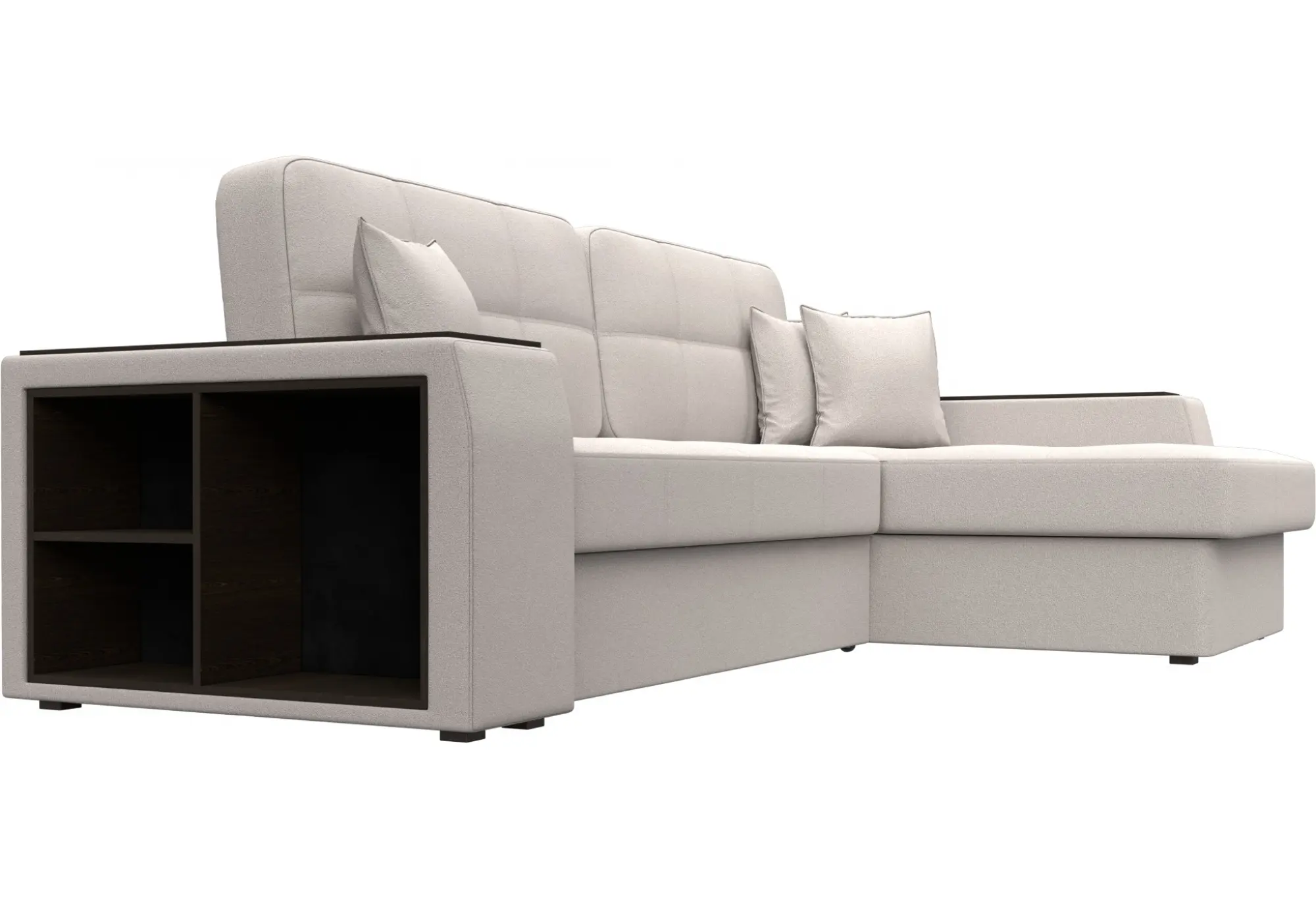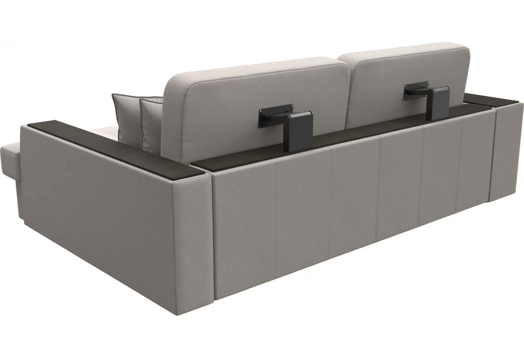 Шикарный угловой диван Брюссель удобен и функционален в использовании. Подлокотники выполняют роль мини-столиков. Одна из боковин дополнена книжными полками, декорированным «под дерево». Под длинной боковиной расположена ниша для белья. Изделие оснащено удобным механизмом трансформации в двуспальную кровать.