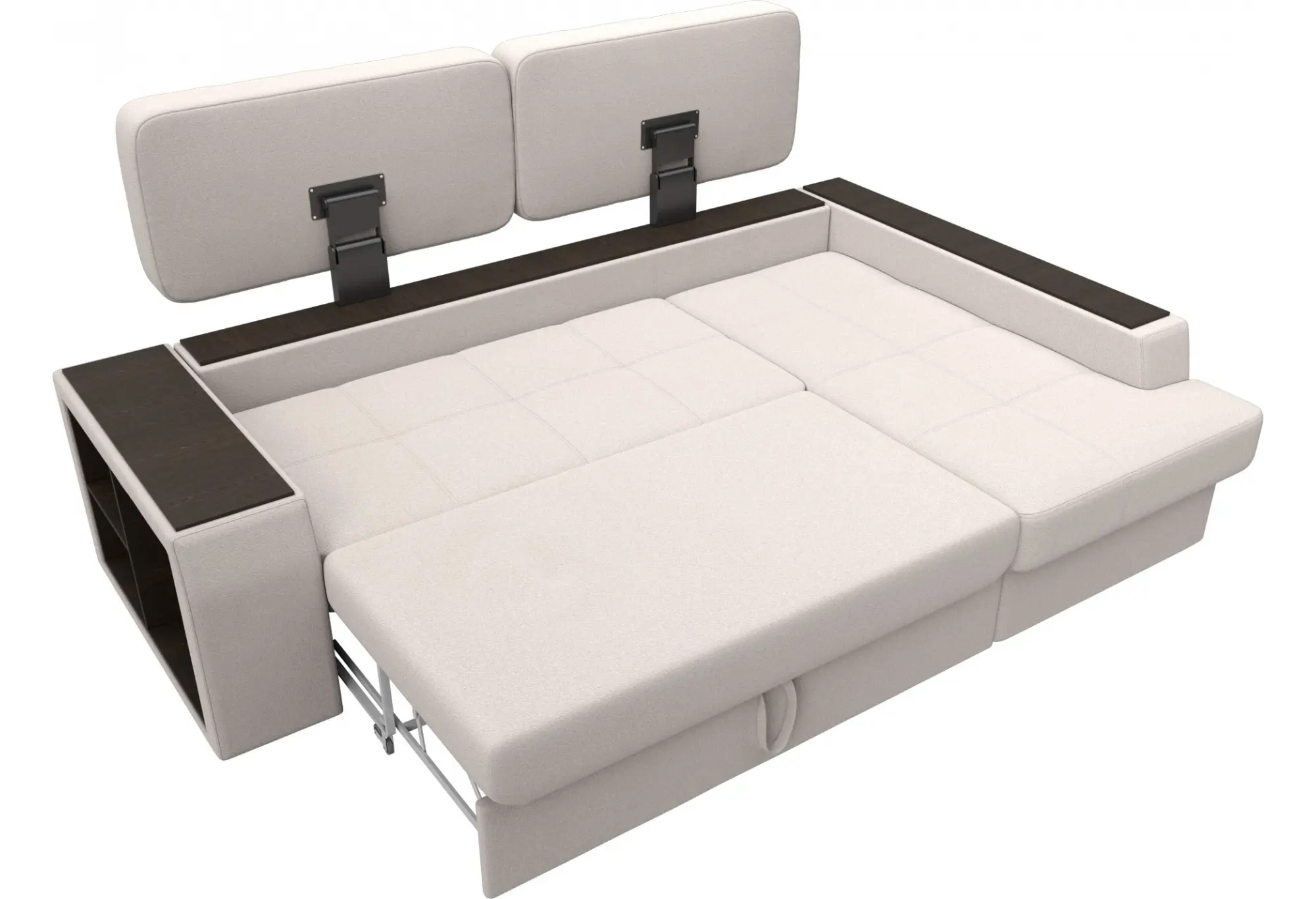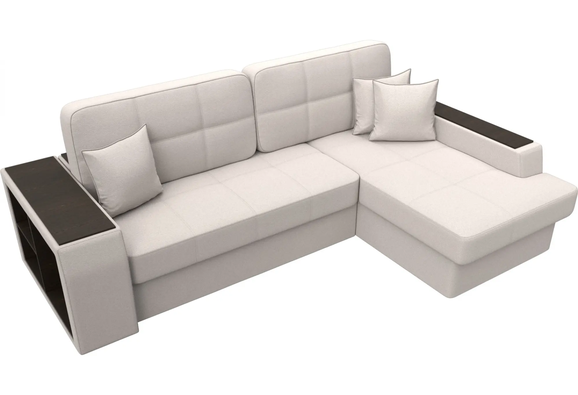 Шикарный угловой диван Брюссель удобен и функционален в использовании. Подлокотники выполняют роль мини-столиков. Одна из боковин дополнена книжными полками, декорированным «под дерево». Изделие оснащено удобным механизмом трансформации в двуспальную кровать.