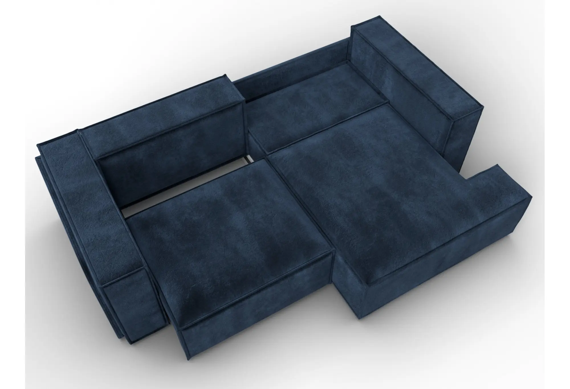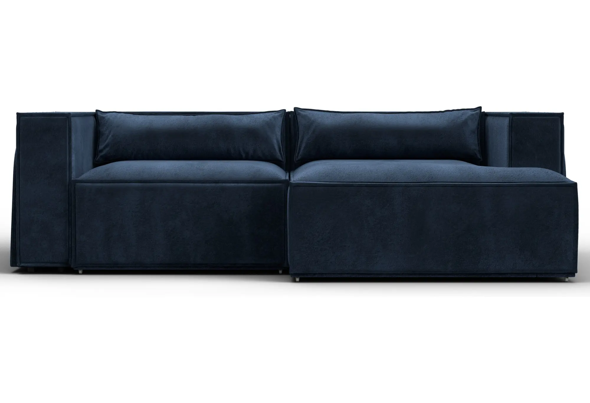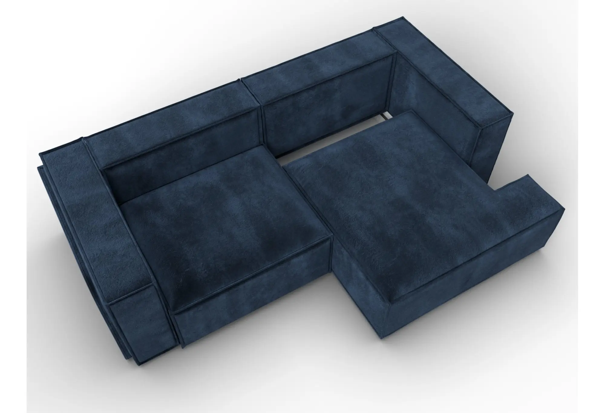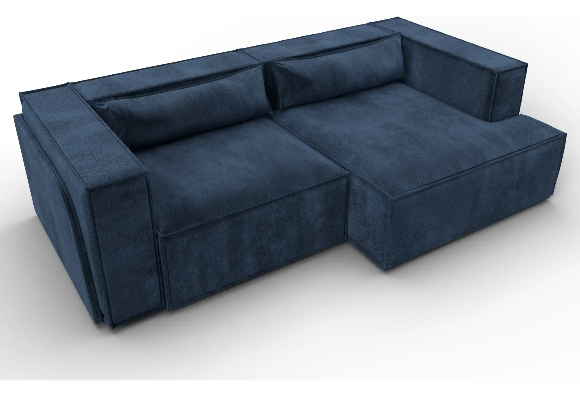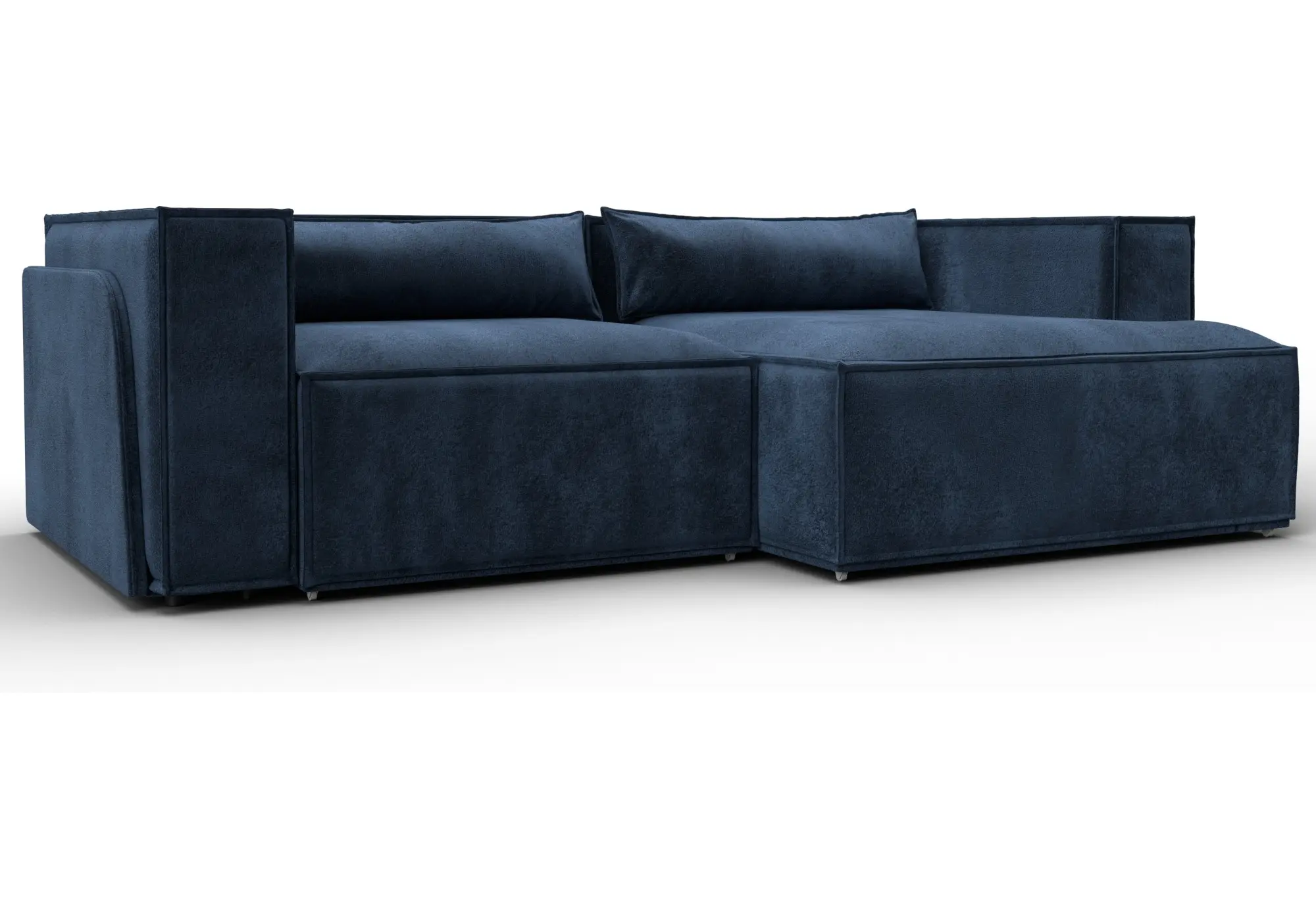 Глубокий синий оттенок велюра делает диван заметным элементом интерьера, при этом сохраняется строгий, собранный внешний вид. Правосторонний угол удобно использовать для зонирования пространства и рационального заполнения угла комнаты.