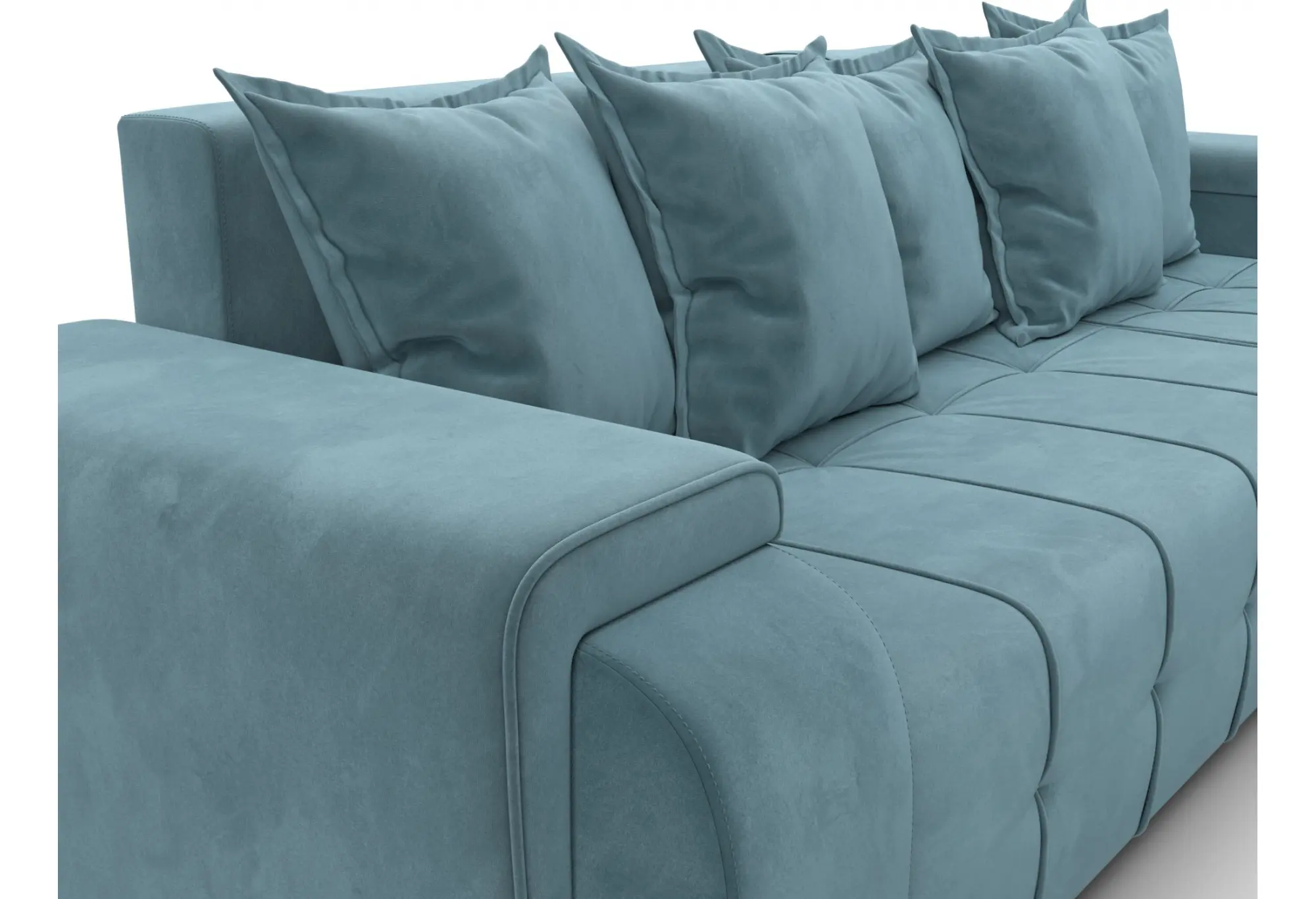 Обивка из велюра приятна на ощупь и визуально делает диван более уютным. Бирюзовый оттенок добавляет интерьеру выразительный акцент, при этом остается достаточно спокойным, чтобы сочетаться с разными стилями оформления — от современного до классического. Крупная стёжка на сиденье и лаконичные геометричные формы придают модели аккуратный и опрятный вид.