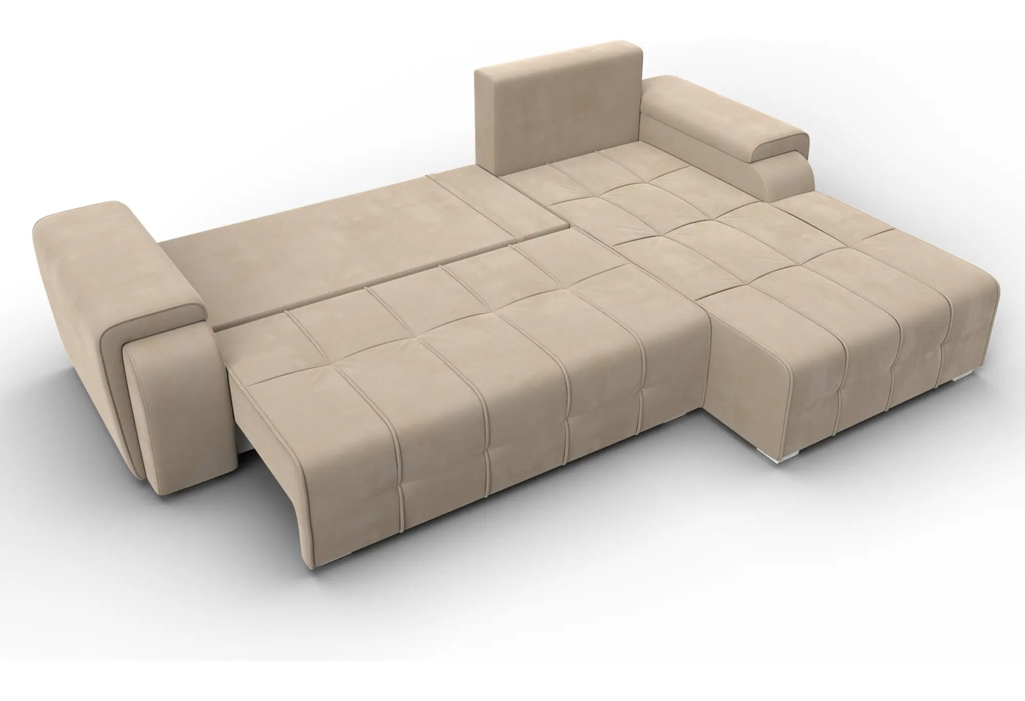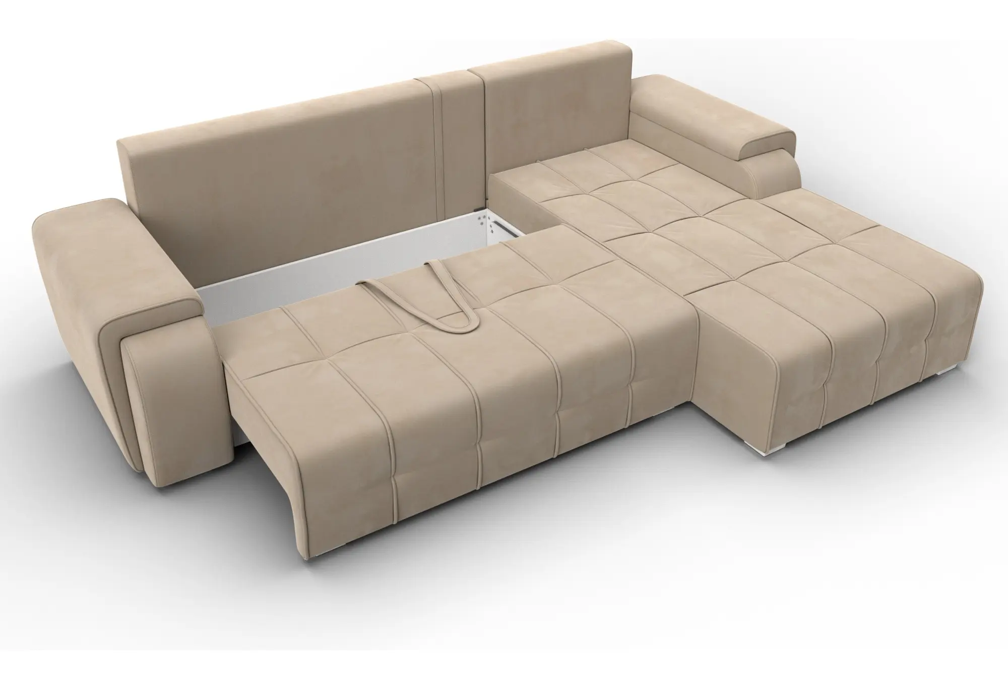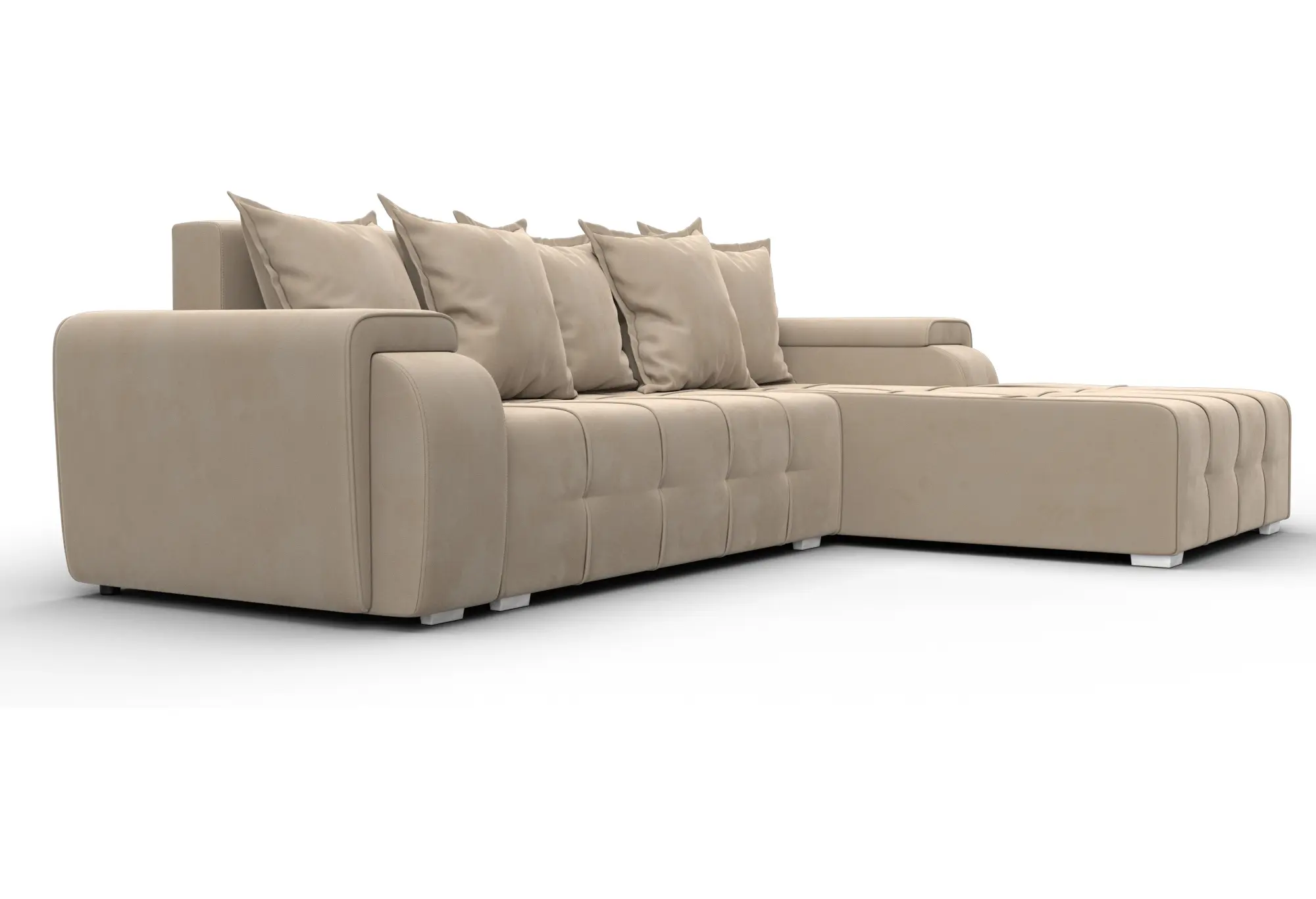 Угловой диван Лига-121 с правым углом в бежевом велюре — практичное решение для гостиной или спальни, когда нужен комфортный отдых днем и полноценное спальное место ночью. Спокойный бежевый оттенок легко сочетается с разными стилями интерьера, визуально делает комнату светлее и создает ощущение порядка и уюта в пространстве.