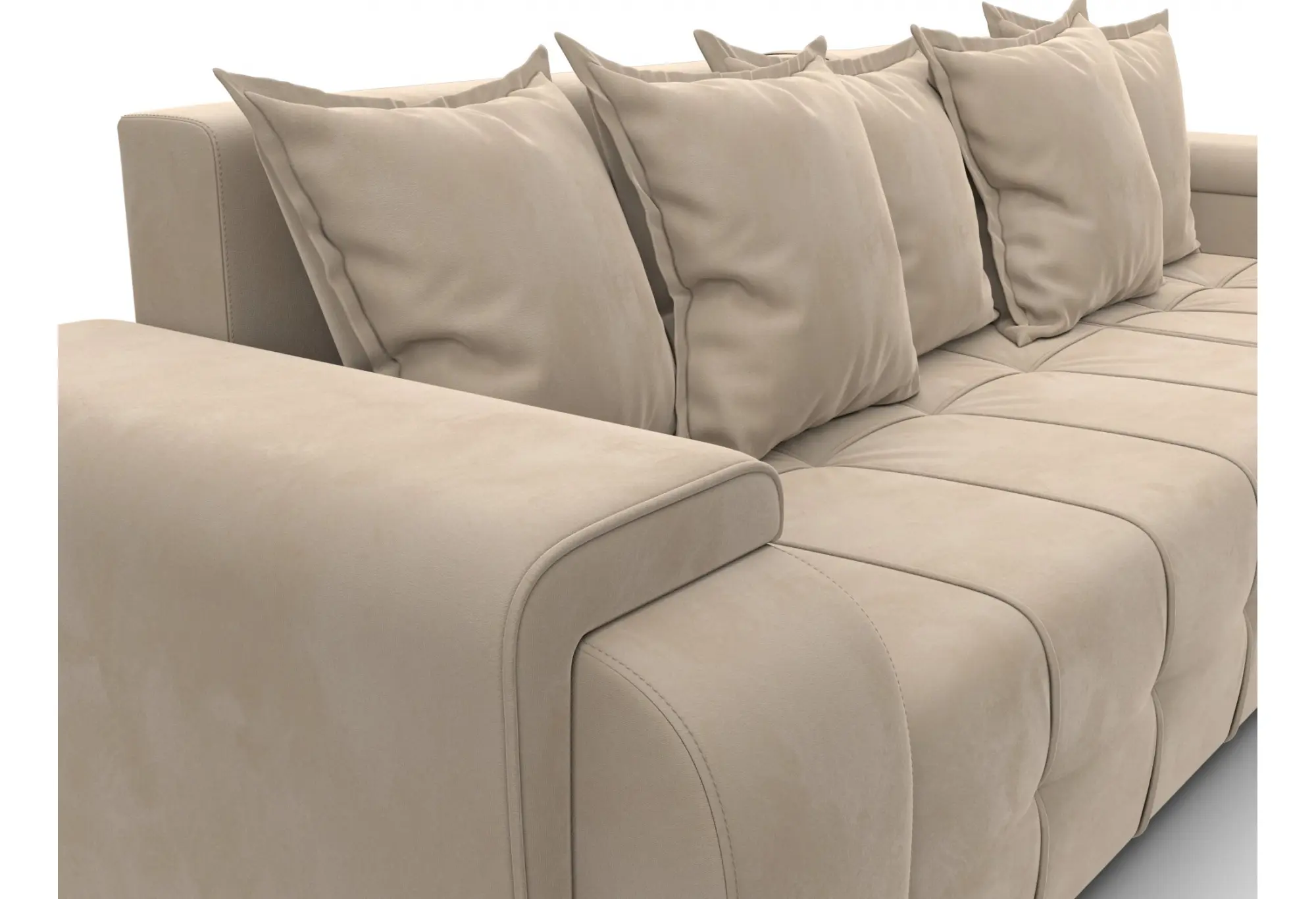 Велюровая обивка приятно выглядит визуально, подчеркивает объем подушек и сиденья и делает диван заметным, но не навязчивым элементом интерьера. Бежевый цвет помогает легко комбинировать модель с любыми акцентами — от нейтральных до ярких.