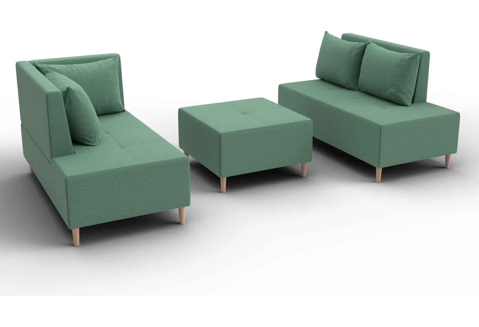 Конструкция состоит из двух основных модулей и отдельного пуфа, за счёт чего диван легко перестроить под текущие задачи - организовать угловую зону для общения, компактное место отдыха или удлинённое сиденье, приставив пуф к основной части. Пуф размером 75×75×42 см можно использовать как дополнительное место для сидения, подставку для ног или как основу под поднос с книгами и аксессуарами.