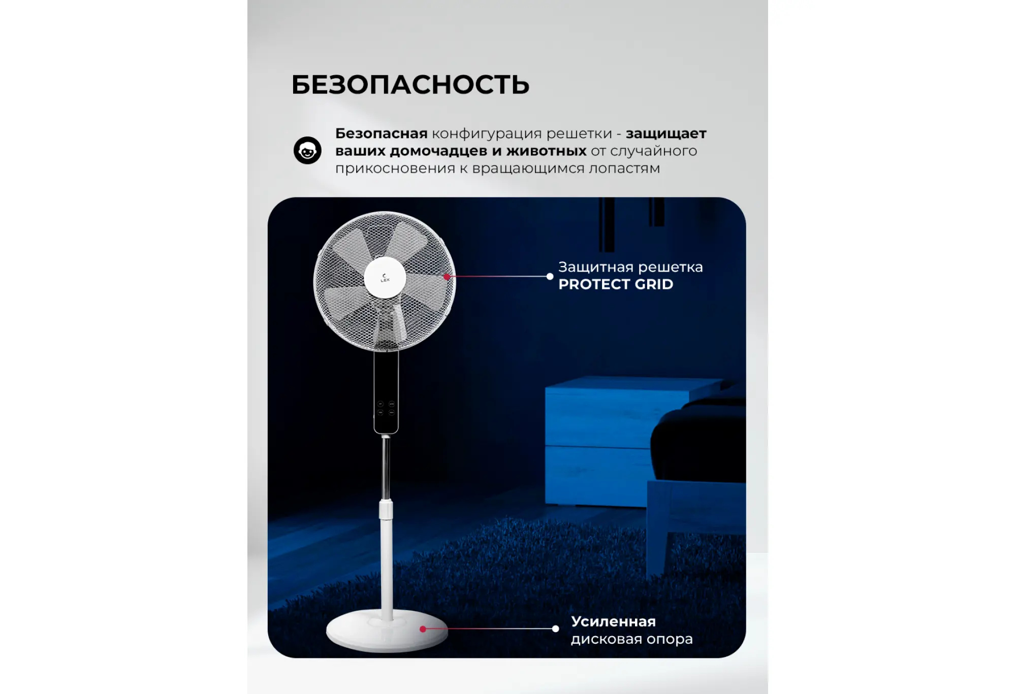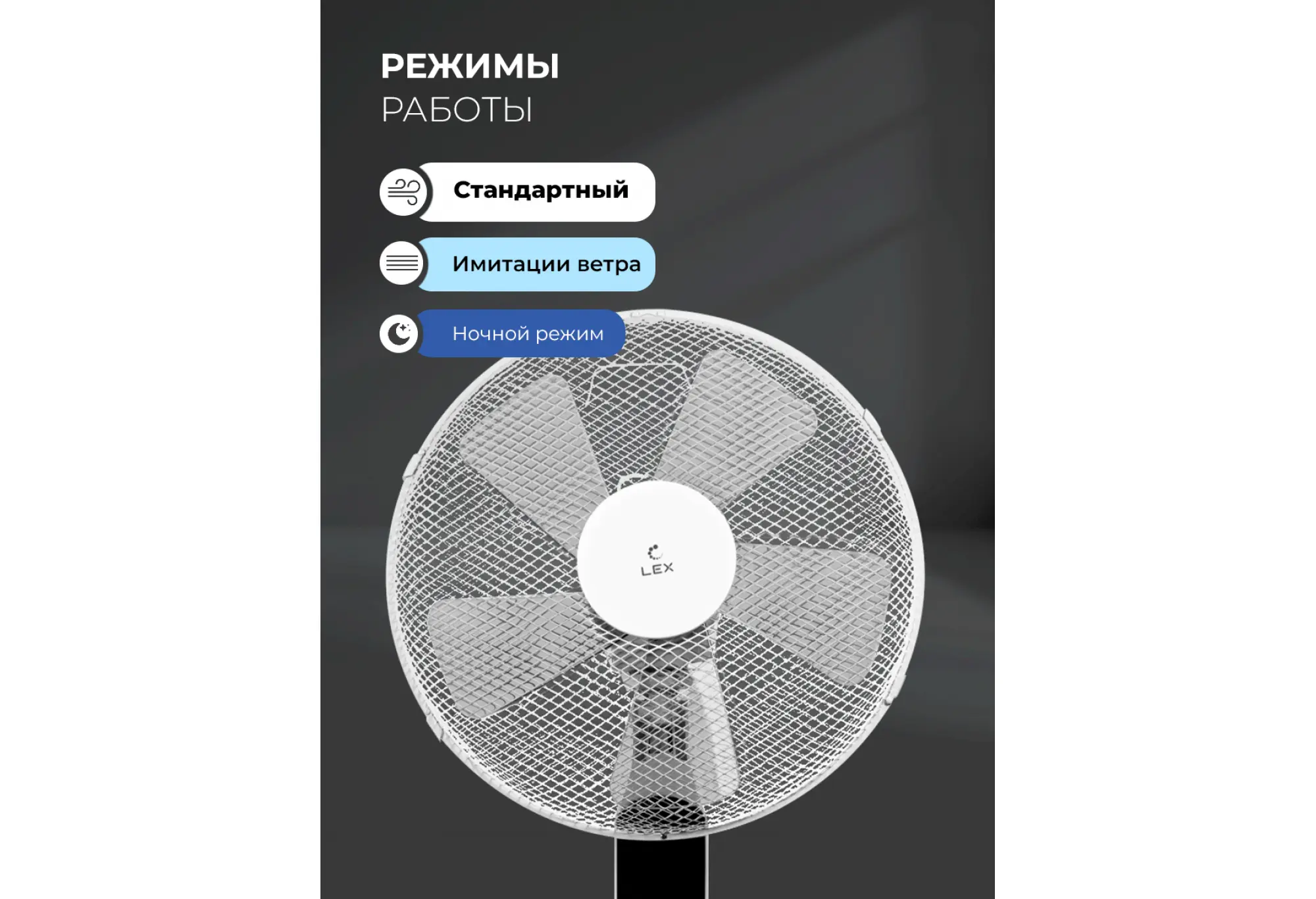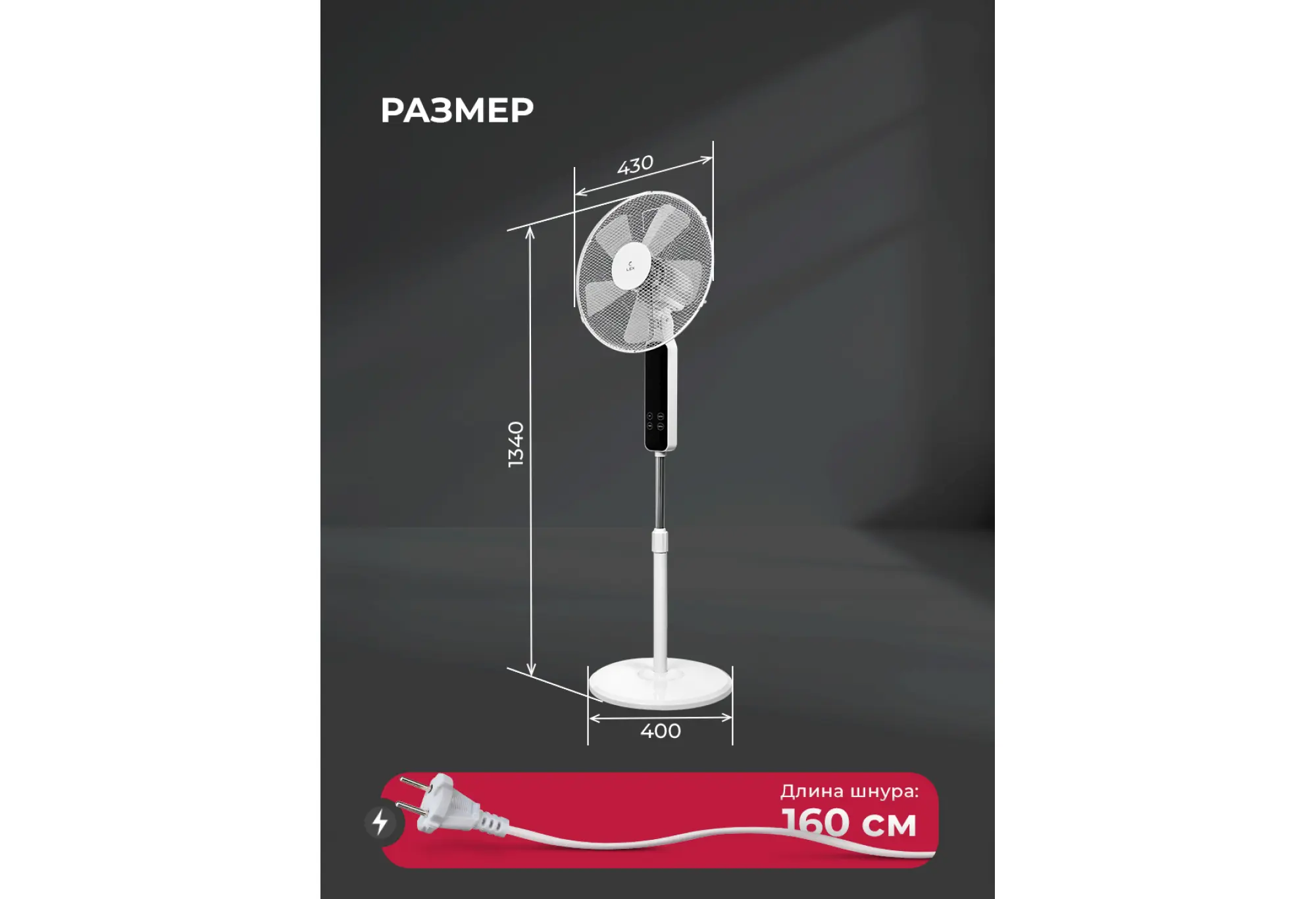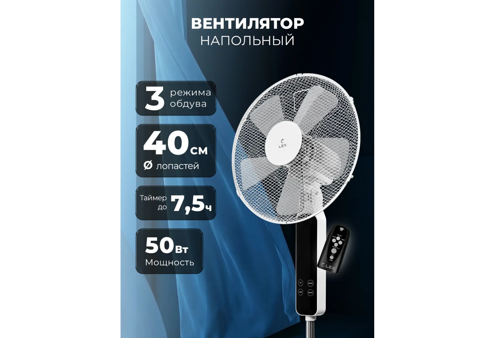Напольный вентилятор LEX LXFC 8348 создан, чтобы обеспечить комфортную прохладу в комнате, не занимая при этом много места. Высота и продуманная конструкция делают его удобным для использования в гостиной, спальне или рабочем кабинете.Модель оснащена крупными лопастями диаметром 40 см и пятью лопастями для ровного и интенсивного потока воздуха. Мощность 50 Вт обеспечивает эффективный обдув при экономичном потреблении энергии. Выбирайте один из трёх уровней скорости в зависимости от температуры в комнате.Для более естественного и комфортного ощущения включите один из трёх режимов работы. В стандартном режиме обдув постоянный, в режиме имитации ветра интенсивность меняется хаотично, а в ночном режиме интенсивность циклически увеличивается и уменьшается для более мягкого сна. Таймер от 0,5 до 7,5 часов позволяет запрограммировать автоматическое отключение, что удобно на ночь или при длительном отсутствии дома.Устройство оборудовано LED дисплеем и пультом дистанционного управления, который входит в комплект. Для удобства эксплуатации предусмотрены автоповорот, регулировка угла наклона и регулировка высоты штанги. Устойчивая подставка и прочная решётка обеспечивают безопасную эксплуатацию в быту.LEX LXFC 8348 сочетает мощный воздушный поток, удобство управления и универсальный белый дизайн, который легко впишется в любой интерьер.