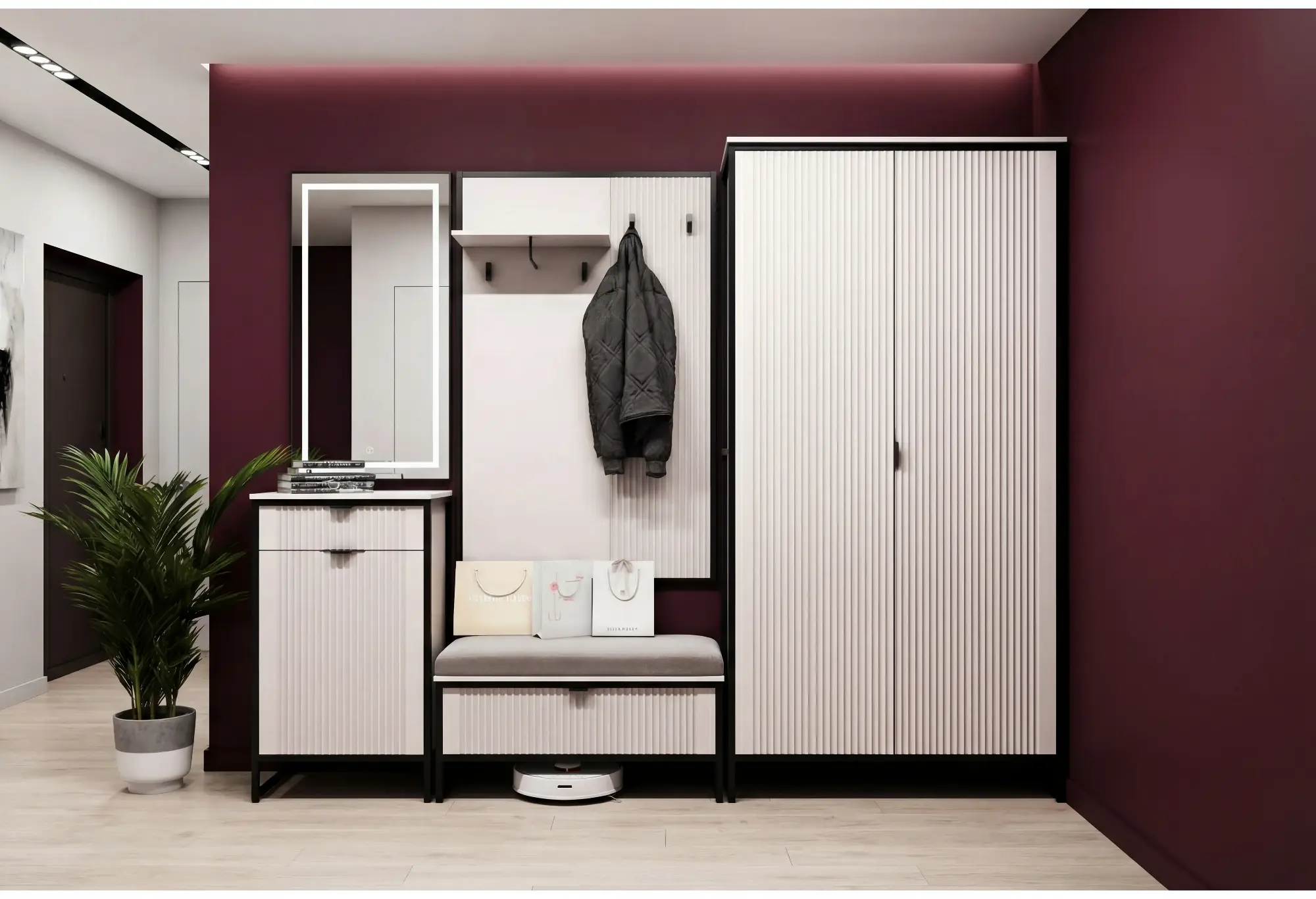 Преимущества:- Компактная глубина — удобно для узких коридоров