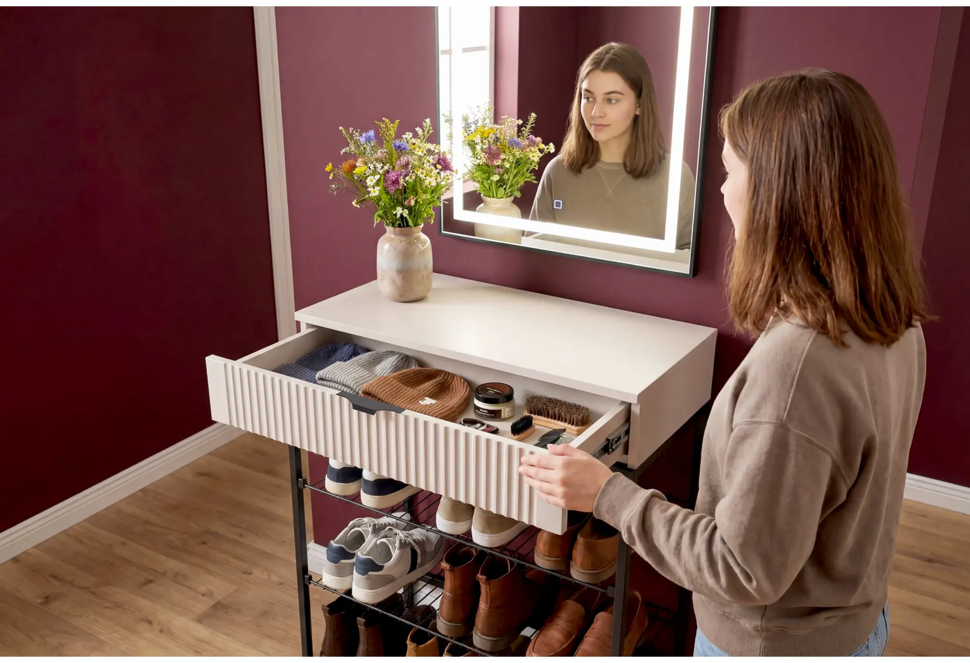 Зеркало "Нора" 4 мм в алюминиевом профиле оснащено пластинами для крепления к стене и светодиодной лентой с сенсорным выключателем.