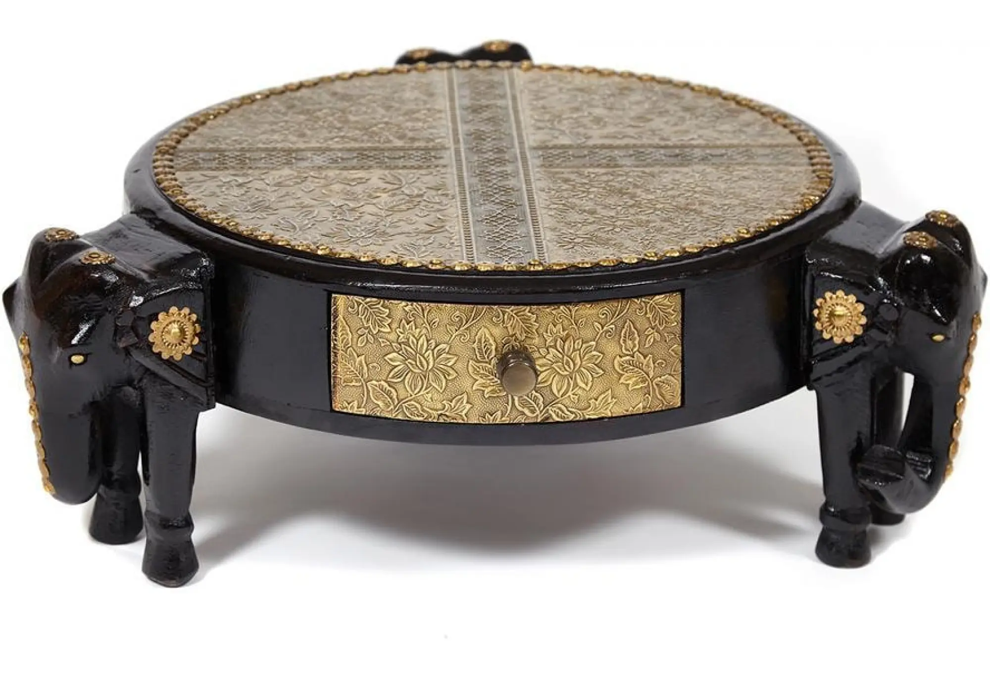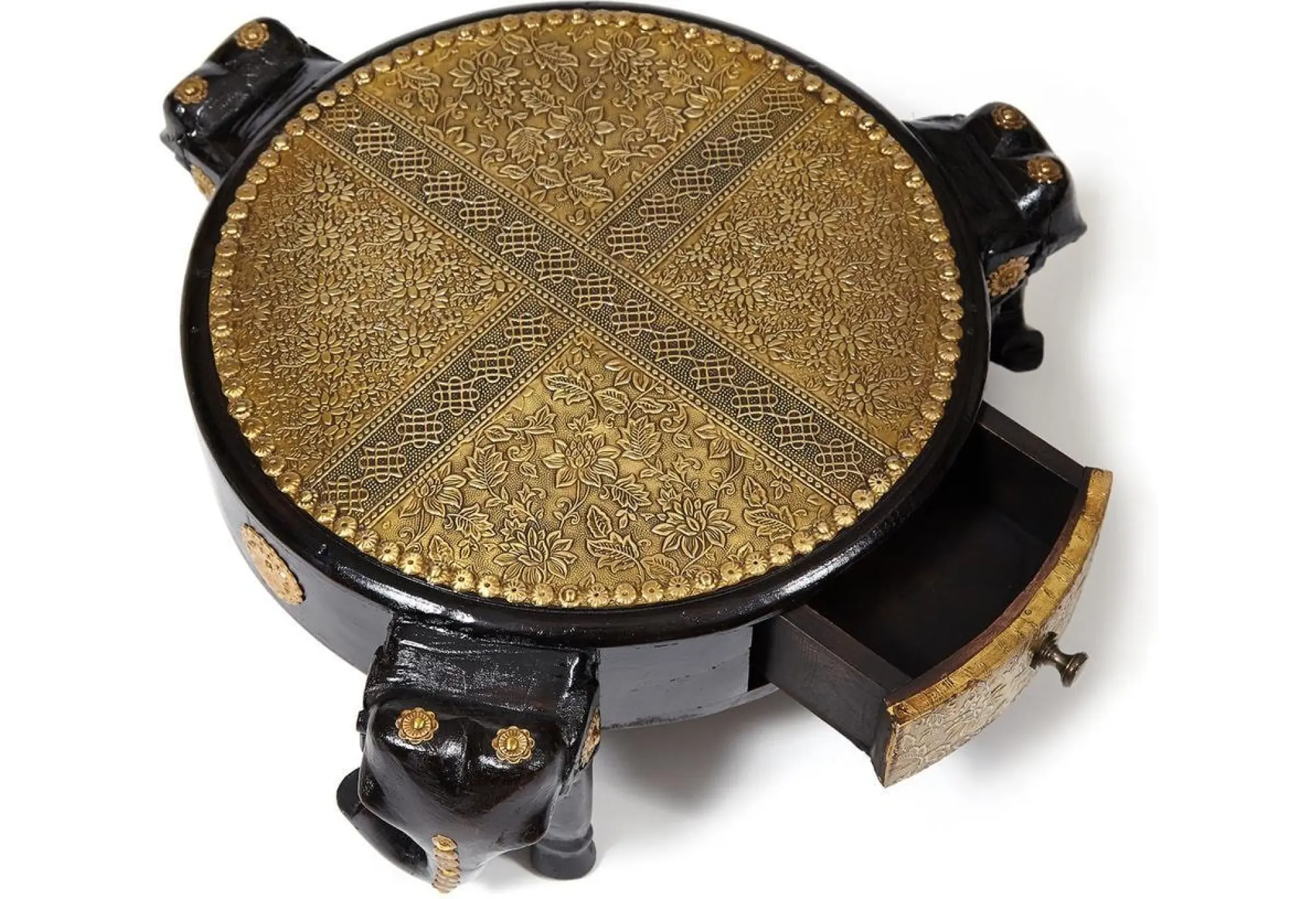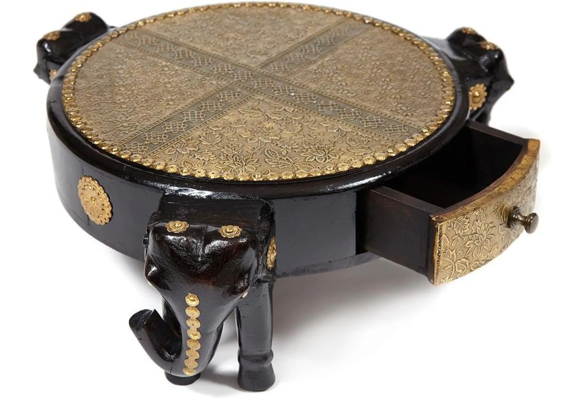 Уникальный столик Secret de Maison 3 SLONA, выполненный индийскими мастерами, добавит самобытной красоты и индивидуальности в ваш интерьер. Качественная ручная работа и традиции мастеров древнего Востока выделяют столик среди привычной мебели. Каркас из древесины манго, покрашенный в черный цвет, оригинальные ножки в виде слонов и изысканная столешница с отделкой под латунь и чеканкой ручной работы подчеркивают уникальность изделия, превращая его в произведение искусства. Компактные размеры, легкий вес и простота конструкции позволяют использовать столик, как по прямому назначению, так и в качестве дополнительной сервировочной поверхности. В небольшом выдвижном ящике можно хранить разные мелочи. Каркас изделия изготовлен из массива дерева манго, он практичен, надежен, прост в уходе и прослужит долгие годы, сохраняя свой первоначальный вид. Столик относится к коллекции ANTIQUE CLOCKS, поставляется в собранном виде.