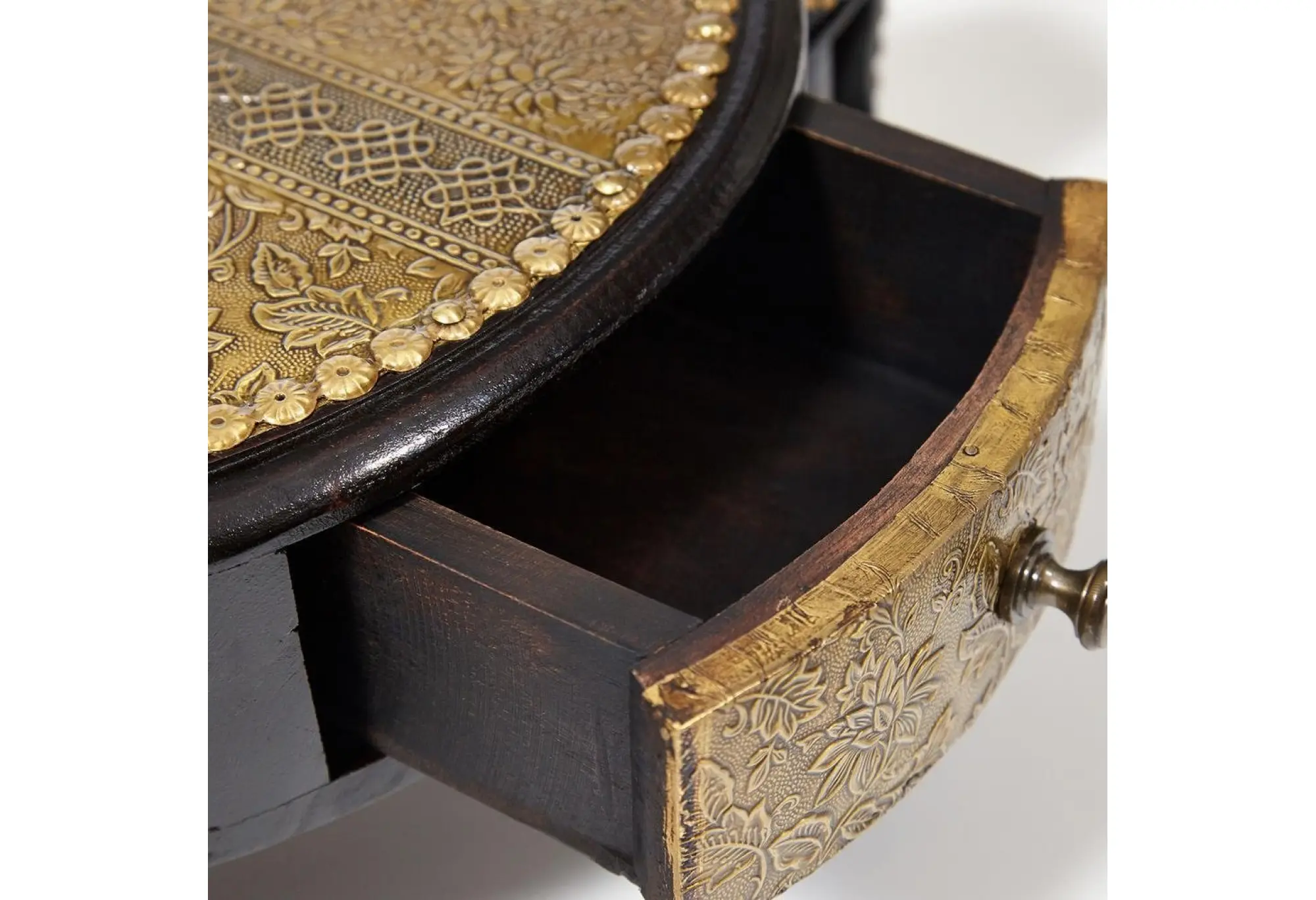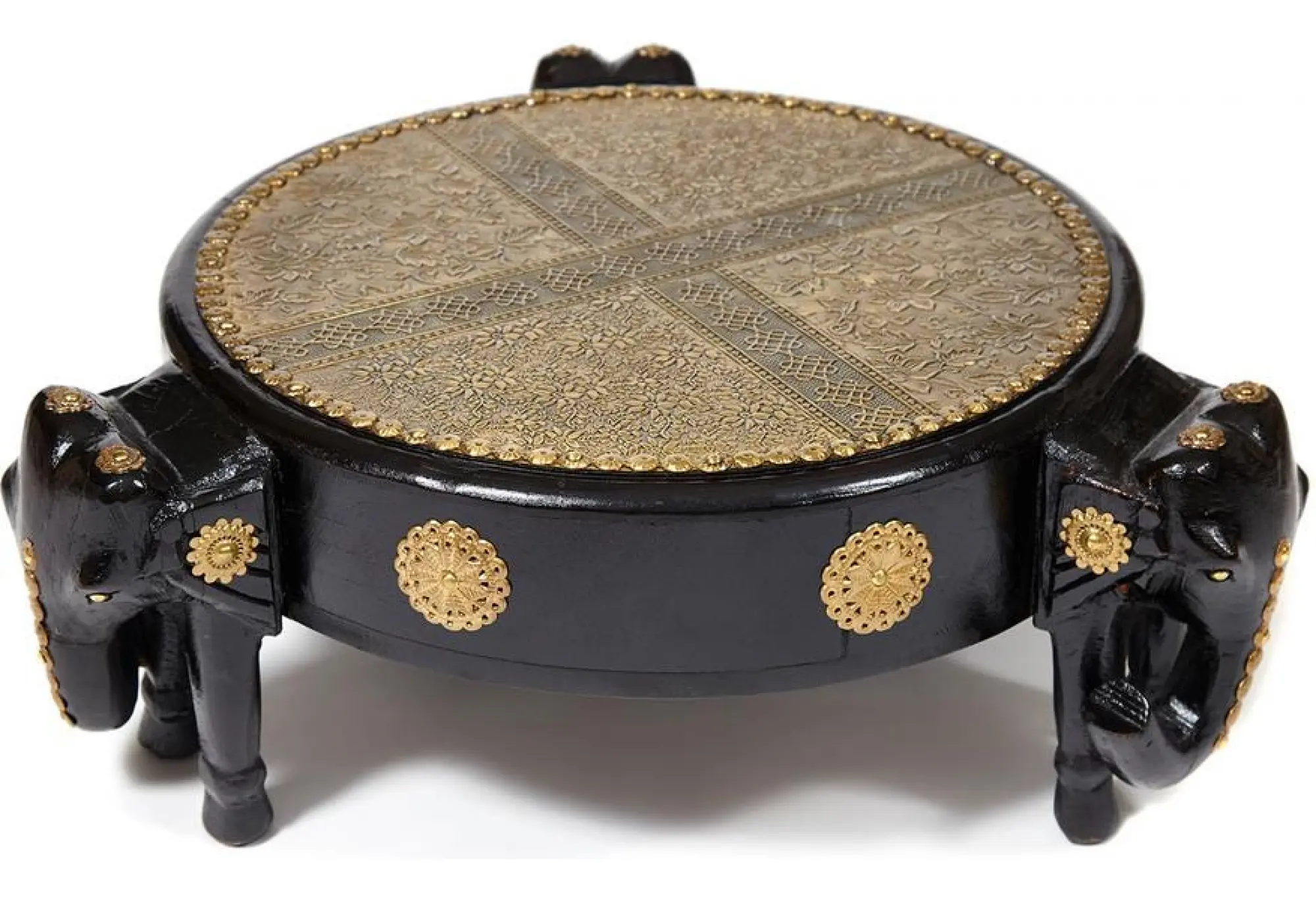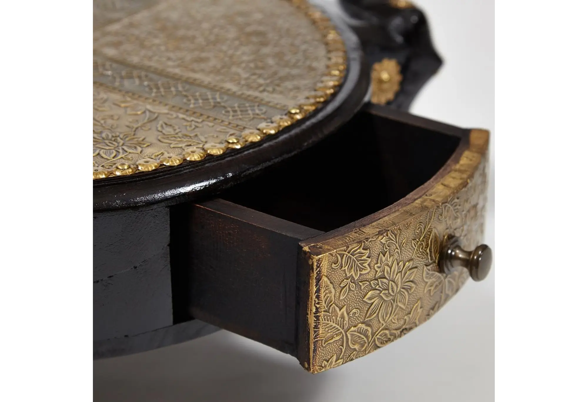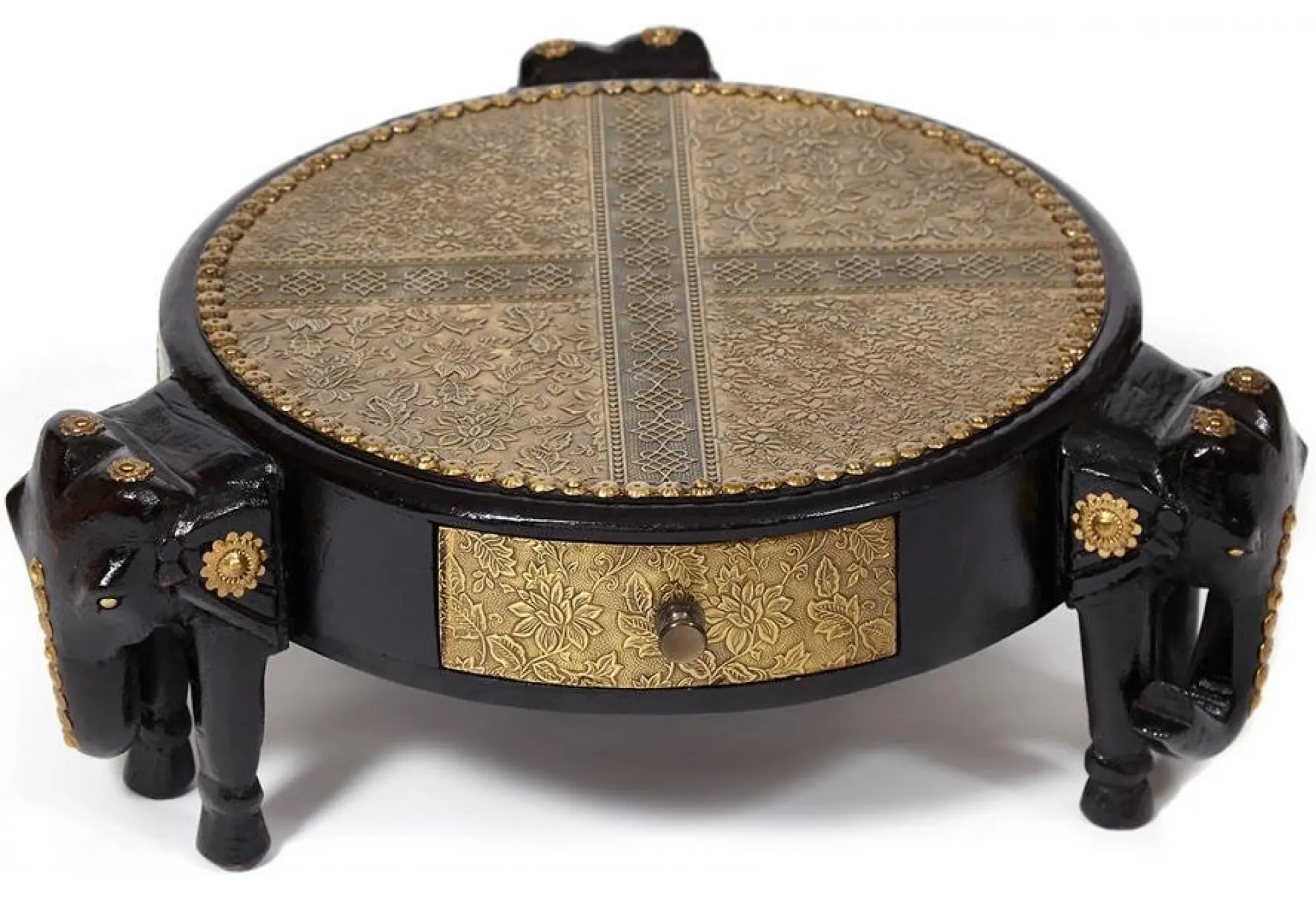 Уникальный столик Secret de Maison 3 SLONA, выполненный индийскими мастерами, добавит самобытной красоты и индивидуальности в ваш интерьер. Качественная ручная работа и традиции мастеров древнего Востока выделяют столик среди привычной мебели. Каркас из древесины манго, покрашенный в черный цвет, оригинальные ножки в виде слонов и изысканная столешница с отделкой под латунь и чеканкой ручной работы подчеркивают уникальность изделия, превращая его в произведение искусства. Компактные размеры, легкий вес и простота конструкции позволяют использовать столик, как по прямому назначению, так и в качестве дополнительной сервировочной поверхности. В небольшом выдвижном ящике можно хранить разные мелочи. Каркас изделия изготовлен из массива дерева манго, он практичен, надежен, прост в уходе и прослужит долгие годы, сохраняя свой первоначальный вид. Столик относится к коллекции ANTIQUE CLOCKS, поставляется в собранном виде.
